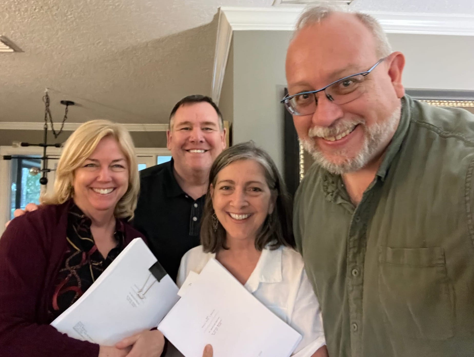 We would meet again at the Tracey home, along with Eleanor (Tim's wife) and their dear friend and collaborator, Susan Eissele. I'd walk them through the "Gerald Ford as a Musical" project and discuss possibilities. It was maybe a week after I’d finished converting the libretto from its original creation within Apple Notes to a much more official format in Final Draft. In fact, the scripts shown in the picture were the first formatted copies ever printed.